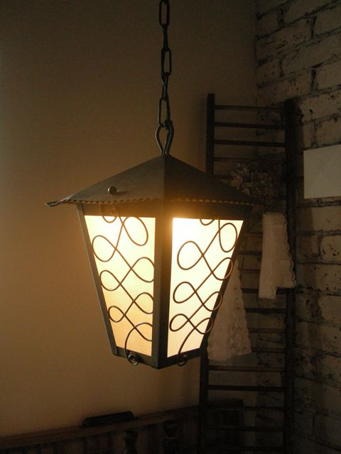 アンティーク 流線模様のランタン 流線模様のワイヤーワーク 笠の一部にへこみがあります 電球を替える時は、笠を取り外します B22の差し込み式電球用 ガラスの内側に欠けが見られます 配線は専門業者へご依頼下さい