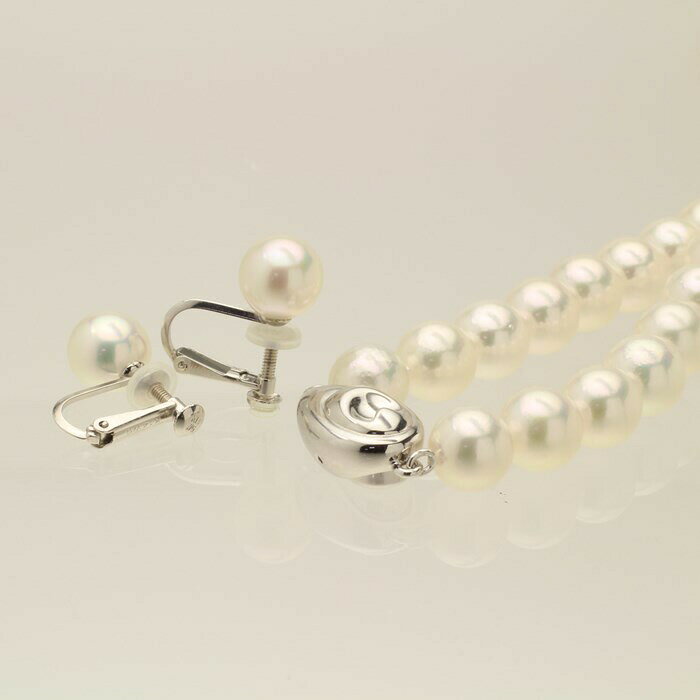 商品情報 素材 ネックレス パール 留め具 シルバーイヤリング パール K14ホワイトゴールド 商品の大きさ ネックレスの長さ 約43cmネックレスのパールの大きさ 約7.5mm〜8mmイヤリングのパールの大きさ 約7.5mm 特徴 花珠真珠のテリにこだわった高品質のネックレスです。