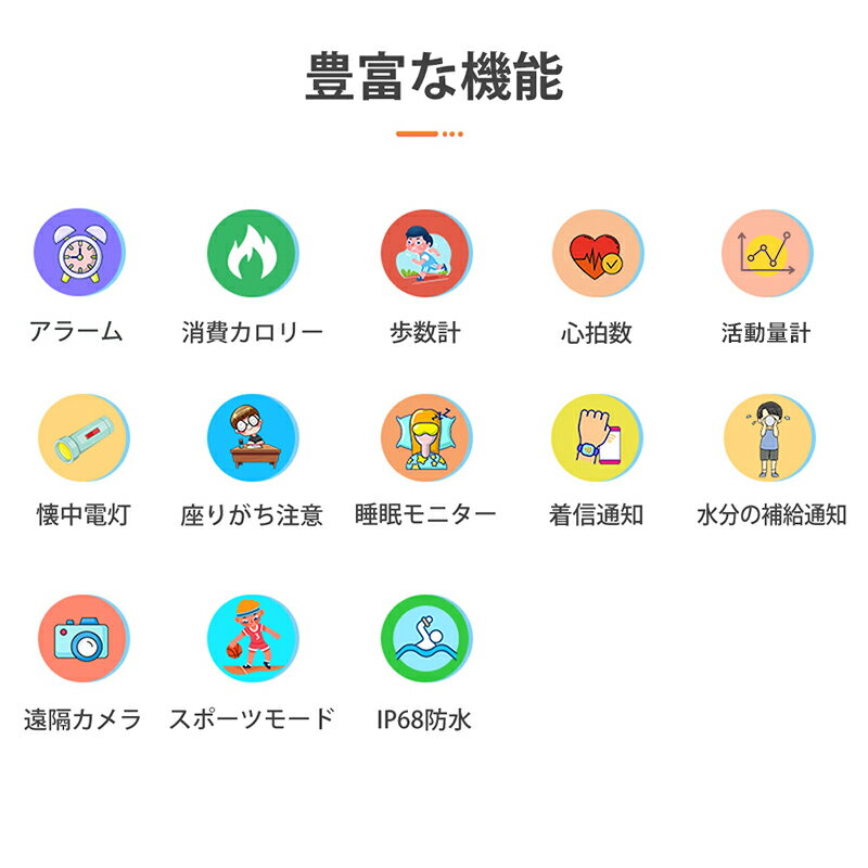 商品のご紹介 商品名 キッズ 腕時計 スマートウォッチ 子供腕時計 多機能 運動レポート スポーツモード 活動計量 心拍数 24時間健康管理 IP68防水 ライフリマインダー機能 睡眠管理 USB充電式 長い待機時間 シリコン製バンド 商品仕様 本体寸法:397*35*10mm バッテリー:170MAH 充電時間:約1時間 解像度:240*240 スクリーン:1.4インチIPSカラースクリーン 本体素材:PC+ABS ハンド素材:シリコン 本体重量:約74 セット内容:本体、USBケーブル、日本語取扱説明書 仕様対象:3歳以上のお子様 言語:日本語、英語、中国語、ドイツ語、フランス語等の10種類 商品特徴 3歳から12歳までのお子さまにぴったりな多機能・キッズスマートウォッチが登場。